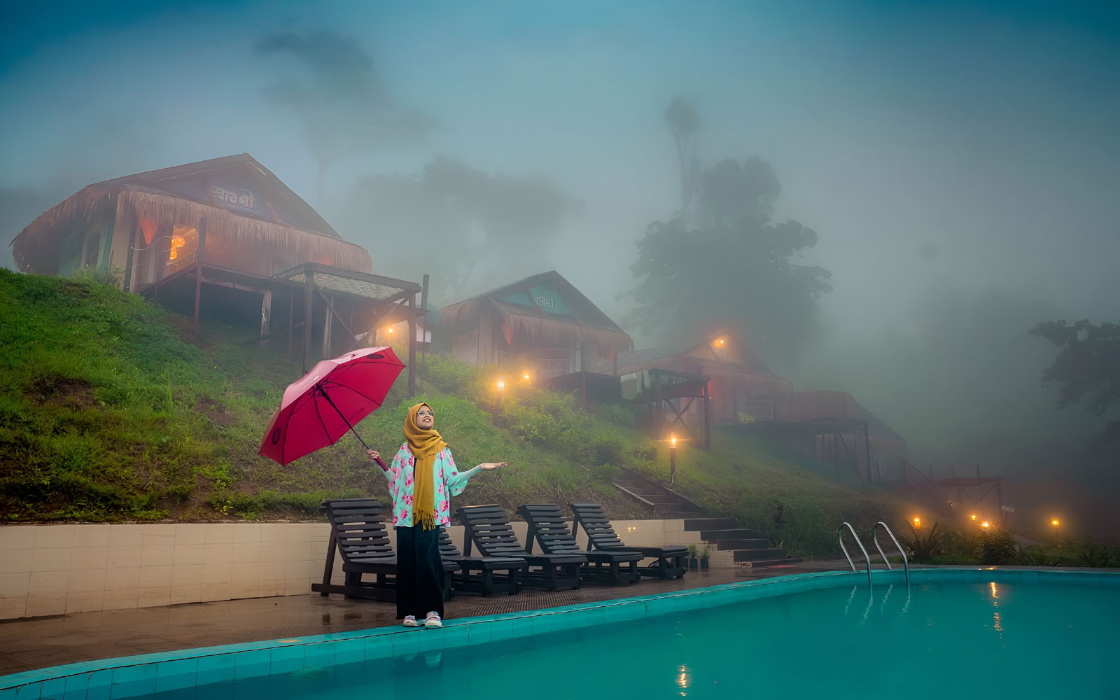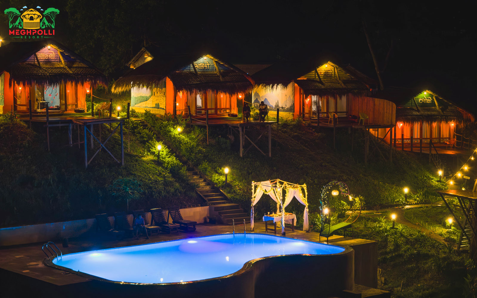 Meghpolli Resort, Sajek is a haven of peace and luxury nestled amidst the breathtaking Sajek Valley. Featuring the first-ever eco mud house and private pool cottage in Sajek, the resort blends traditional charm with modern comfort. Guests can relax in the infinity swimming pool while enjoying the panoramic hillside views of Mizoram or choose the exclusive Bashonti Cottage with its private pool for ultimate privacy.
