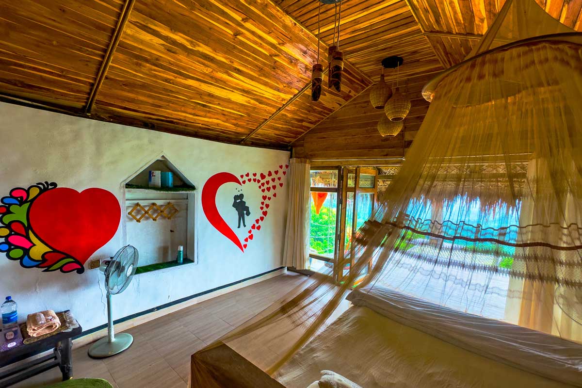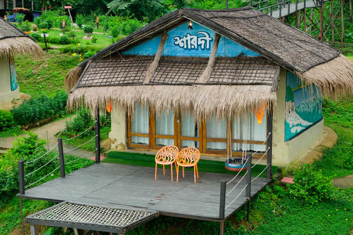 Sharodi cottage comprises 1 couple Bed and 1 drawer bed, 1 Bedside Table, 1 stand fan, 1 infinity balcony with attached bed hammock. The room is furnished with a bookshelf and 1 large mirror. Our modern-fittings spacious bathroom is equipped with standard toiletries as well as all the amenities. A Complimentary Bottle of water, Breakfast, Morning tea, and access to the Infinity swimming pool are provided during your stay. You will get a full infinity hill view of Mizoram from inside and outside the cottage.
